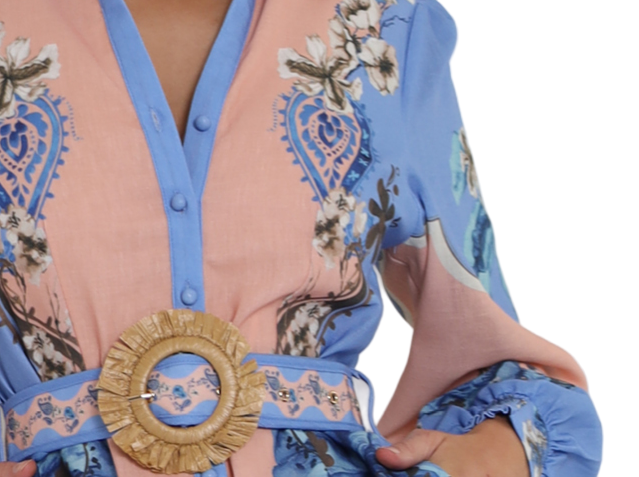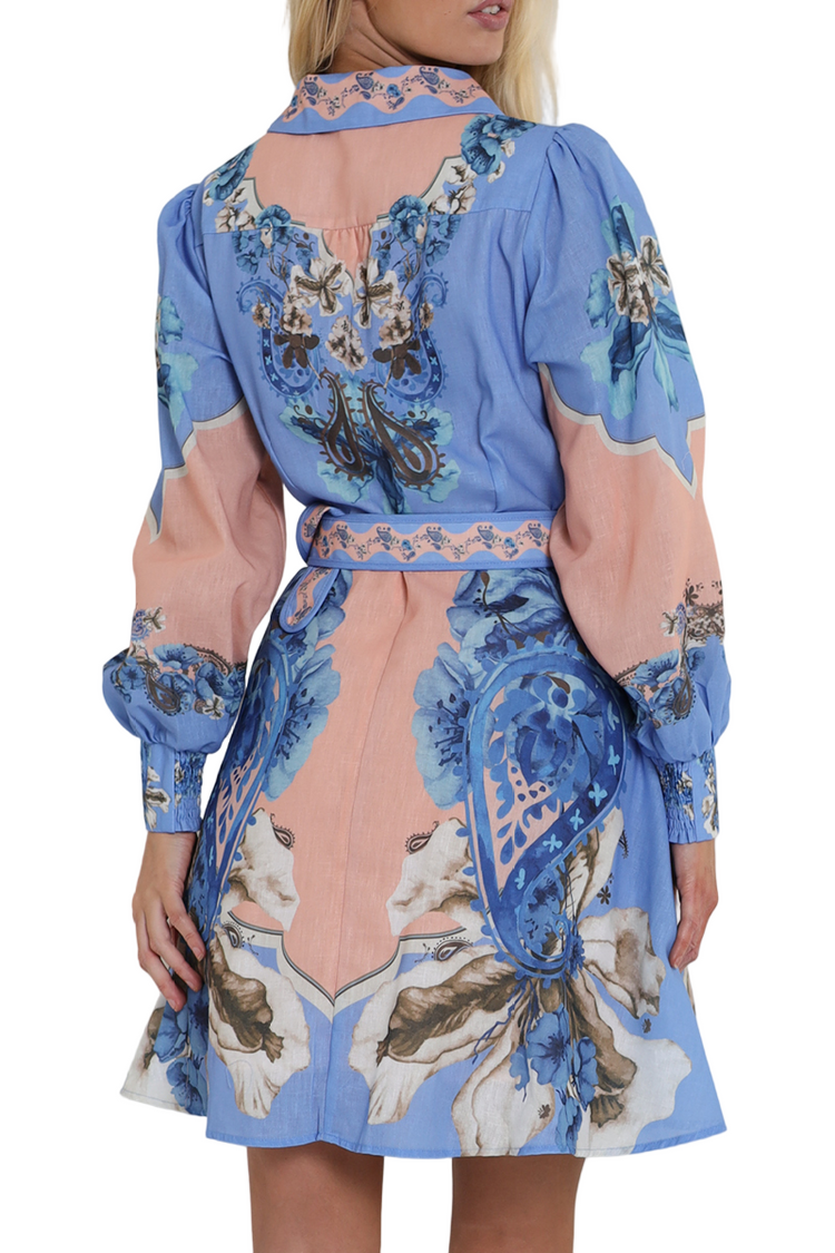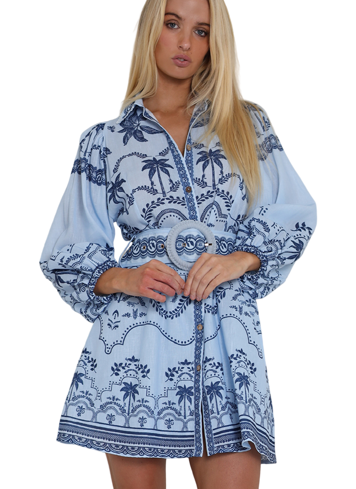 Isla Blue Print Short Dress with Matching Belt – Feminine Flair, Perfectly Cinched